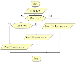 Dane są dwie liczby. Opracuj algorytm wybierający większą z nich, w przypadku gdy są równe wypisz stosowny komunikat. Narysuj schemat blokowy algorytmu.