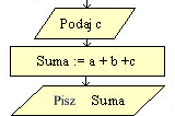 Opracuj algorytm obliczający sumę trzech wprowadzonych z klawiatury liczb. Narysuj schemat blokowy.