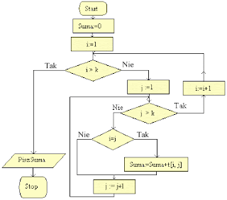 Zbuduj algorytm sumujący elementy na przekątnej tablicy k x k.