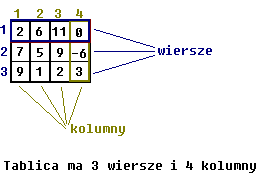 I tak w naszej tablicy o nazwie t zapis t[3,4] oznacza element w trzecim wierszu i czwartej kolumnie, czyli element o wartości =3.