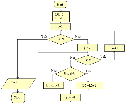 Tablica kwadratowa m x n składa się z zer i jedynek. Podaj algorytm wypisujący ile jest zer i ile jedynek.